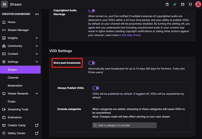 Step 3. On the Channel page, click "Stream" in the left menu and enable "Store past broadcasts" in VOD Settings to automatically back up all your videos.